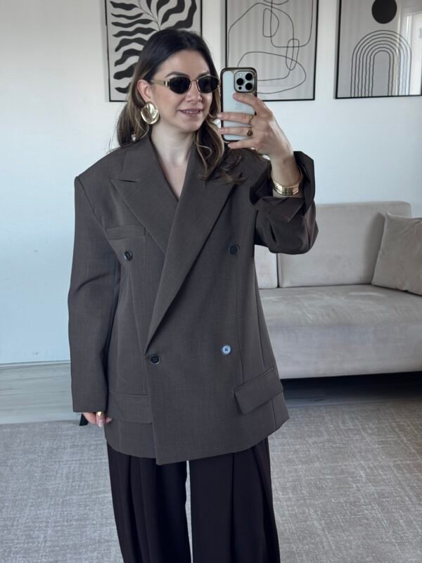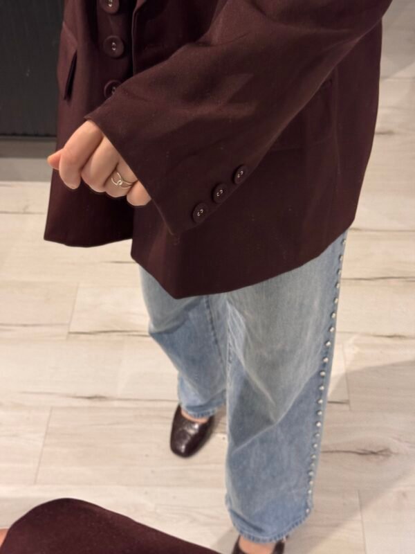 59,90 €Coupe ample et droite, typique d’un blazer oversize, Épaules structurées qui donnent une silhouette un peu carrée et chic, Longueur qui arrive sous les hanches, ce qui accentue l’effet oversize, Double boutonnage sur le devant (deux rangées de boutons). Boutons foncés, discrets, qui se fondent bien avec la couleur du […]