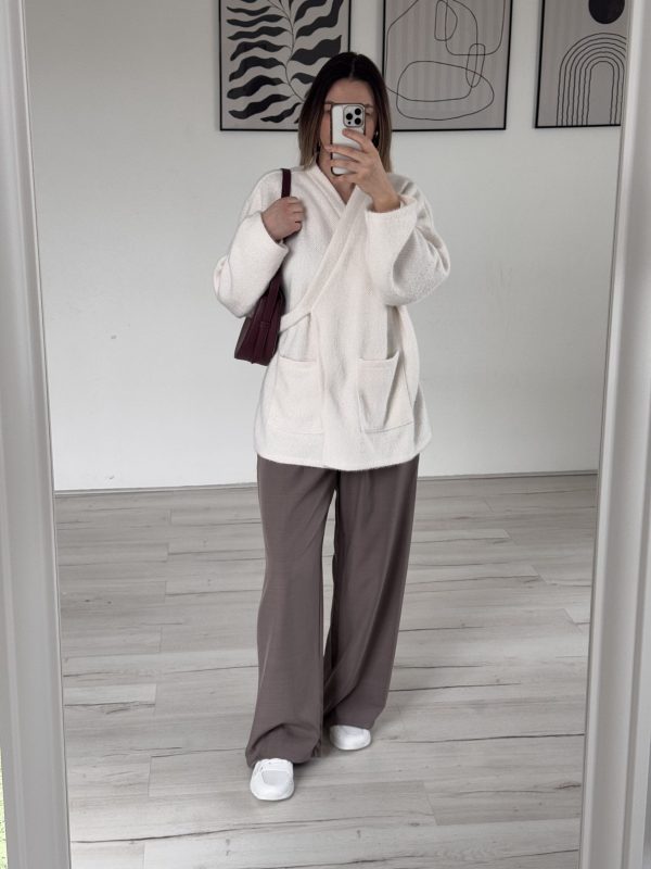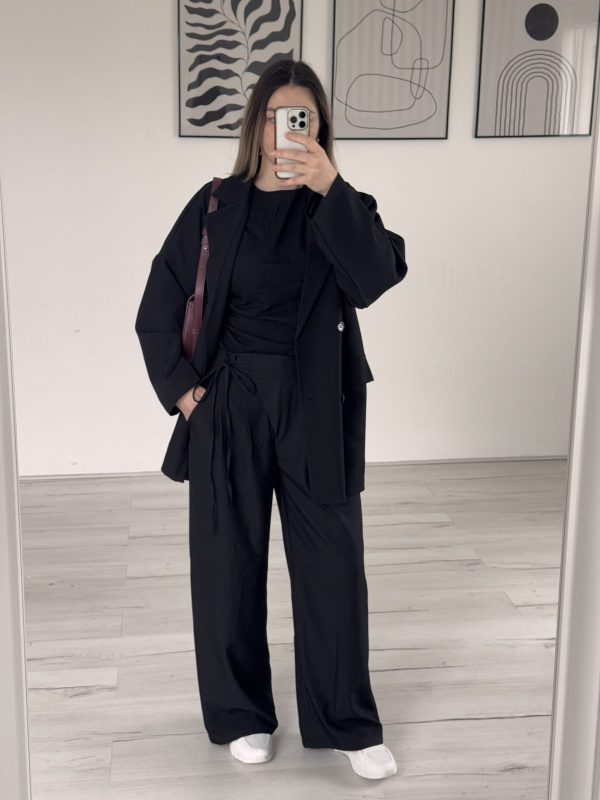 Pantalon fluide et ample, Elastique à la taille, Attachable avec bouton/braguette, Deux poches de chaque côtés, Fait 102 cm de longueur, Disponible en S/M; M/L ; L/XL , Le mannequin mesure 1m67 et fait 64kg, porte du S/M sur la photo, Existe en couleurs noir et taupe