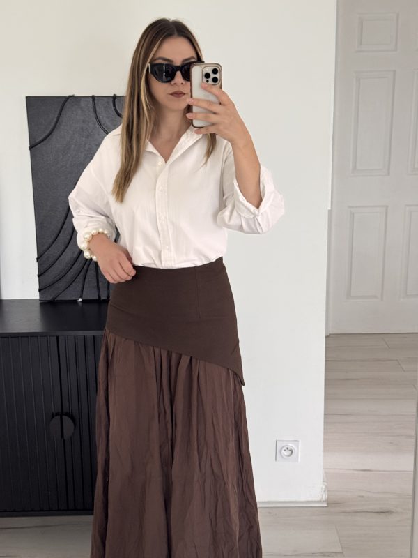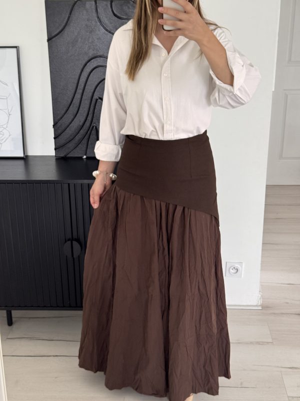 21,90 €Jupe bi matière La jupe fait 105,5 cm de longueur, Fermeture à l’arrière de la jupe, elle est totalement opaque, Existe en S, M, L et XL Le mannequin mesure 1m67 et fait 64kg, porte du M